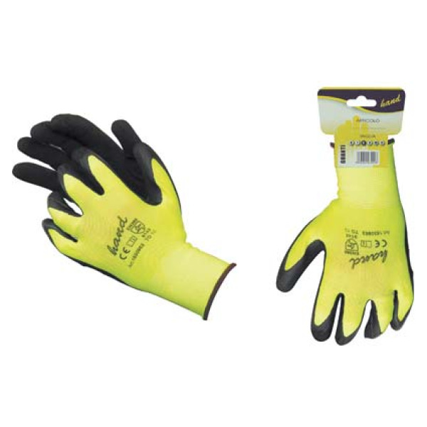 In maglia di nylon a filo continuo giallo, con spalmatura in schiuma di lattice nero, rugoso ed antiscivolo sul palmo. Polsino elastico in maglia. Alta resistenza allo strappo ed all’abrasione. Ideale per lavorazioni dove occorre una buona presa sugli oggetti, buona tattilità e protezione meccanica. Dispositivo di protezione individuale (DPI), categoria 2. Protezione contro i rischi meccanici conforme alla normativa EN388, con livelli 2131X.