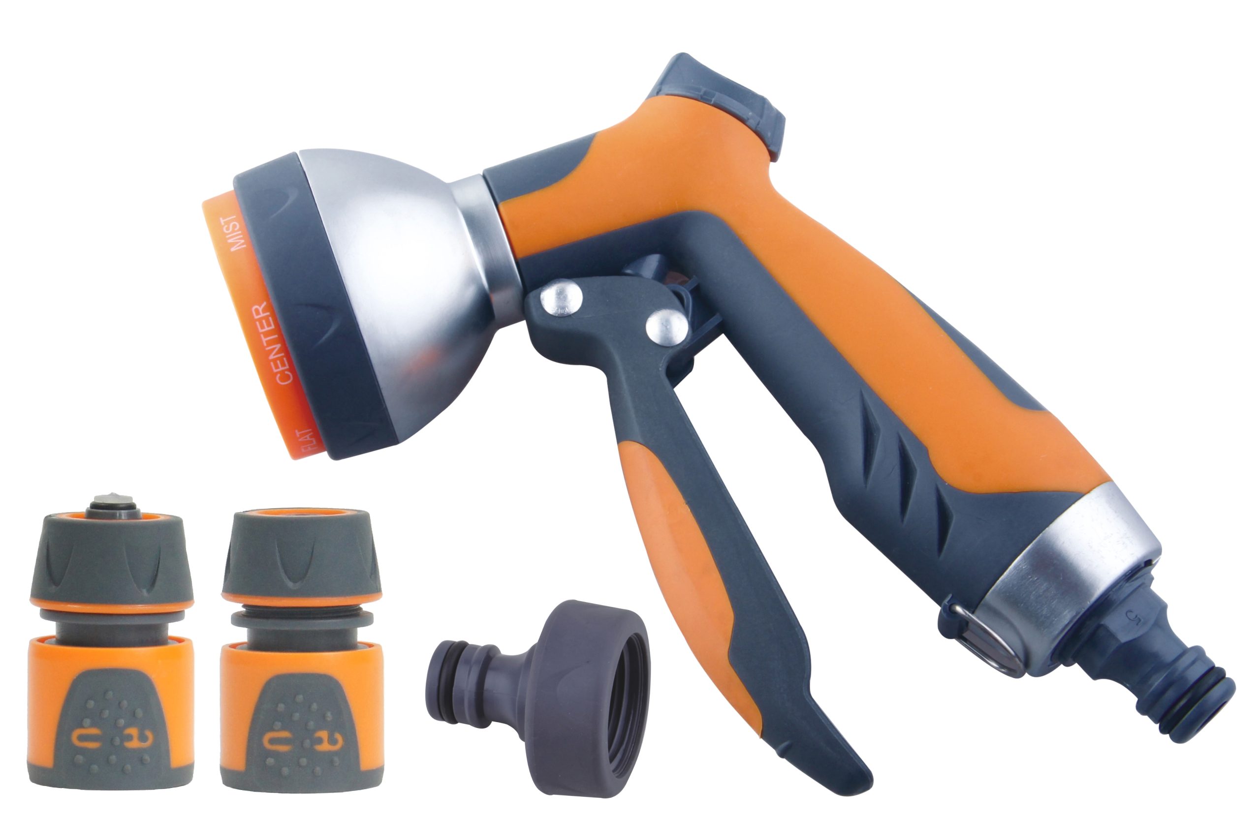 Art. YM 7224 con regolazione della portata e del getto. Grilletto ergonomico con blocco automatico. Completa di 3 raccordi Confezione da 4 pezzi