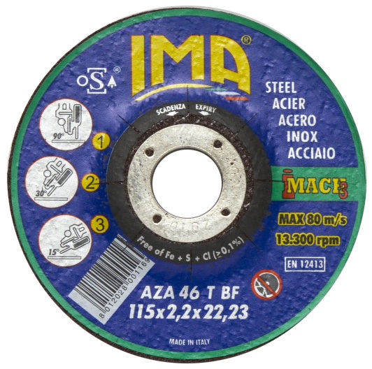 Mod. IMACH3 disco sottile a centro depresso su macchineportatili. Per tagliare, sbavare e rifinire in un unico disco. La particolare miscela di abrasivi mantiene bassa la temperatura di esercizio, rifinendo i materiali senza alterarne le superfici. Ideale su inox e materiali ferrosi. Foro 22,2 mm. Spessore 2,2 mm. Diametro 115 mm.