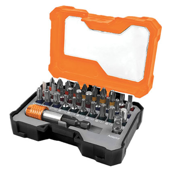 Composto da 1 portainserto magnetico 1/4″xMm. 65, 30 inserti 1/4”xMm. 25 in acciaio S2: PH1, PH2, PH2, PH3, PZ1, PZ2, PZ2, PZ3, TA3, TA4, TA5, TA6, HEX3, HEX4, HEX5, HEX6, T10, T15, T20, T25, T27, T30, T40, TX10, TX15, TX20, TX25, TX27, TX30 e TX40. 1 adattatore 1/4″xMm. 25. In pratico box plastico. In blister.