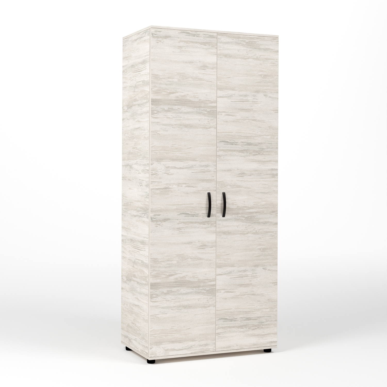 armadio due ante. Interna un’asta appendiabiti e un ripiano fisso. Maniglie in metallo, piedini regolabili. Dimensioni 80 x 52 x h 205 cm. Colore bianco ven.