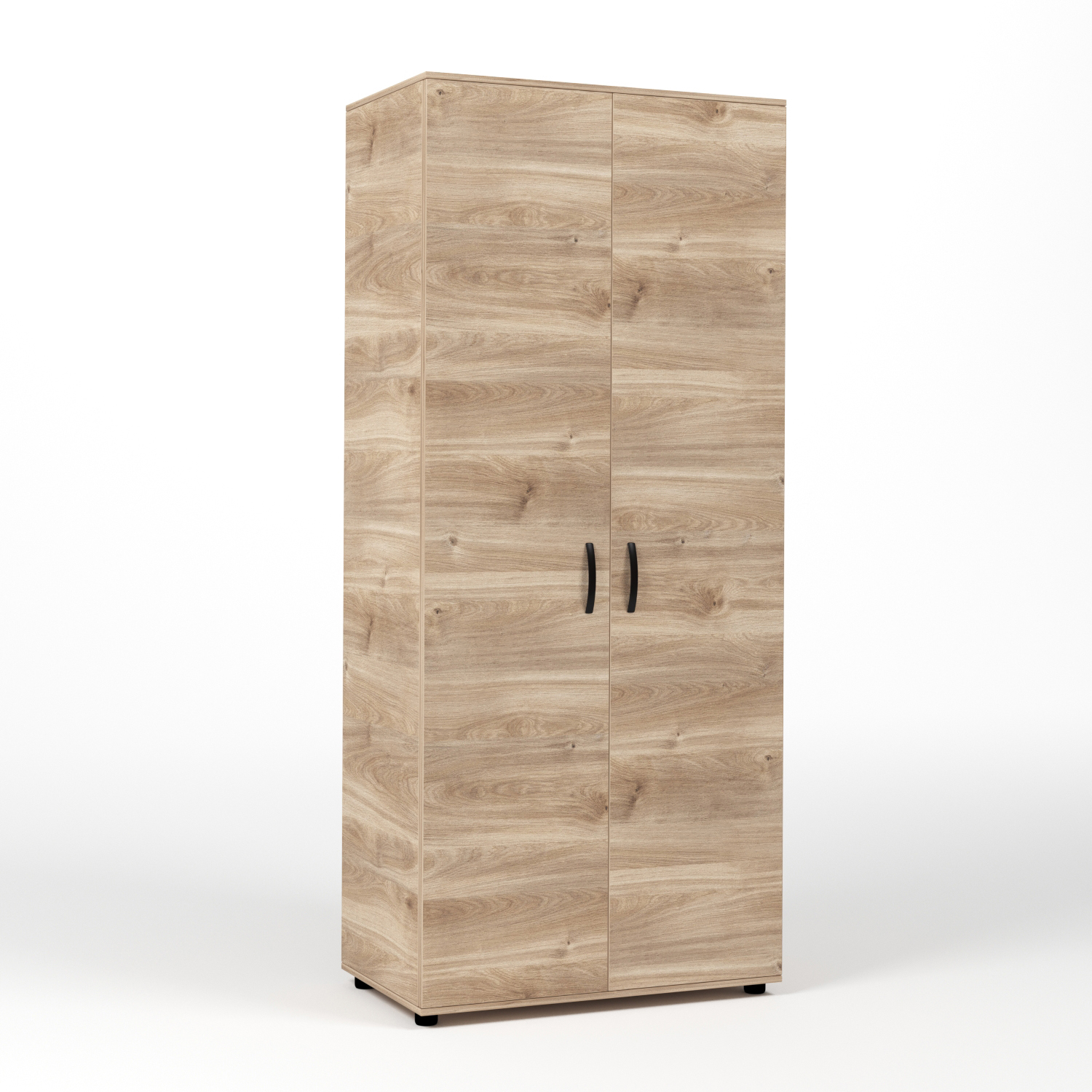 armadio due ante. All’interno un’asta appendiabiti e un ripiano fisso. Maniglie in metallo, piedini regolabili. Dimensioni 80 x 52 x h 205 cm Colore rovere plat.