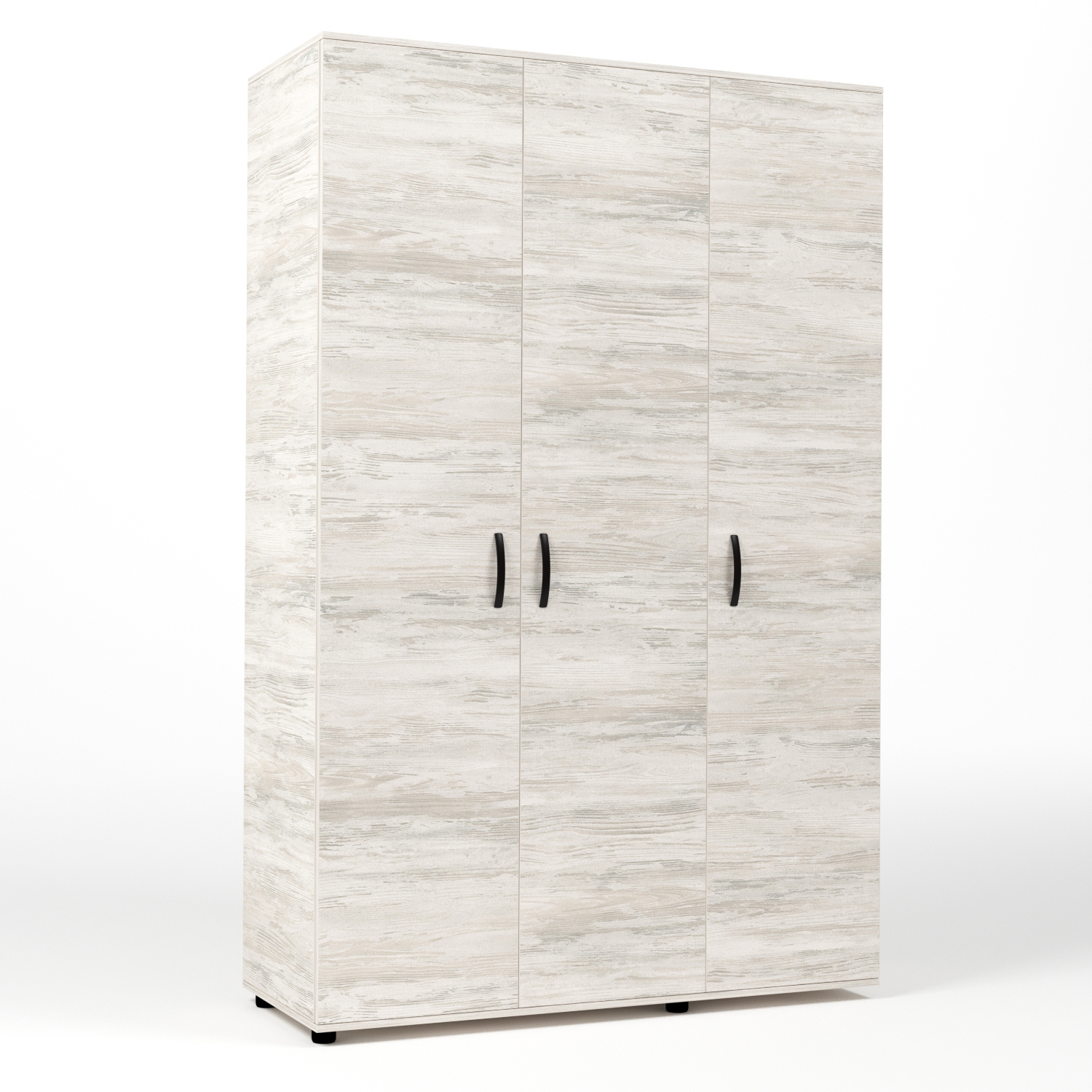 armadio tre ante. Interno due aste appendiabiti e 4 ripiani. Maniglie in metallo e piedini regolabili. Dimensioni 120 x 52 x h 205 cm. Colore bianco ven.
