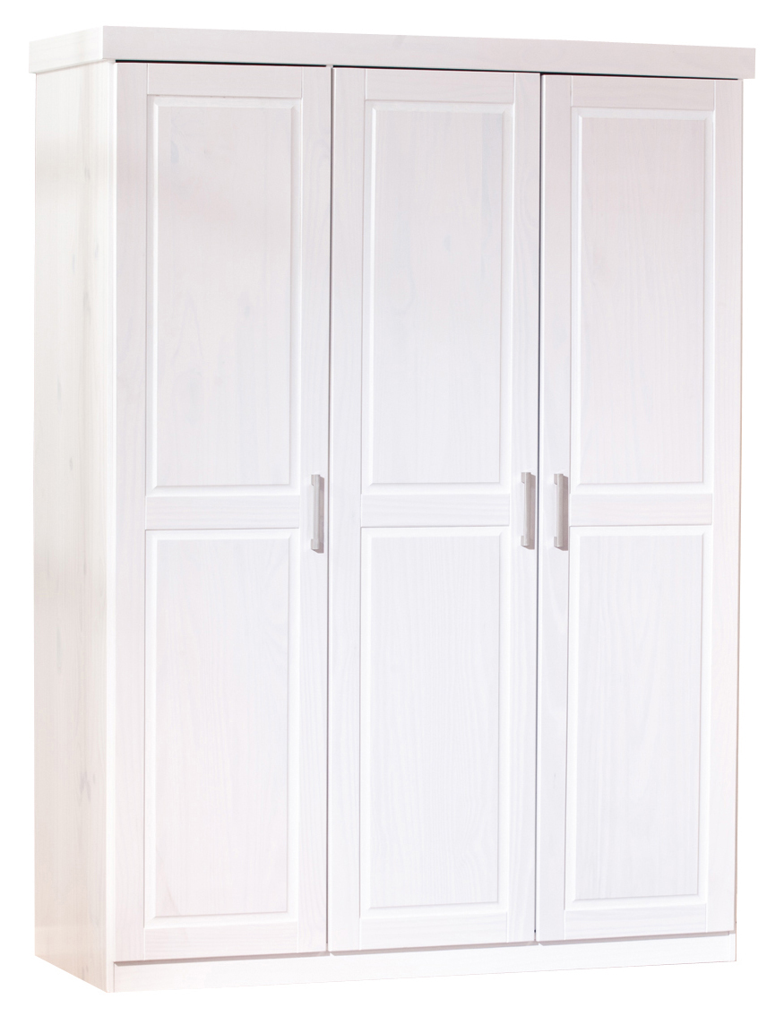con struttura in pino massello, a 3 ante con maniglie, 4 ripiani interni e asta appendiabiti. Verniciato ad acqua. Dimensioni 140 x 55 x h 190 cm. Colore bianco.