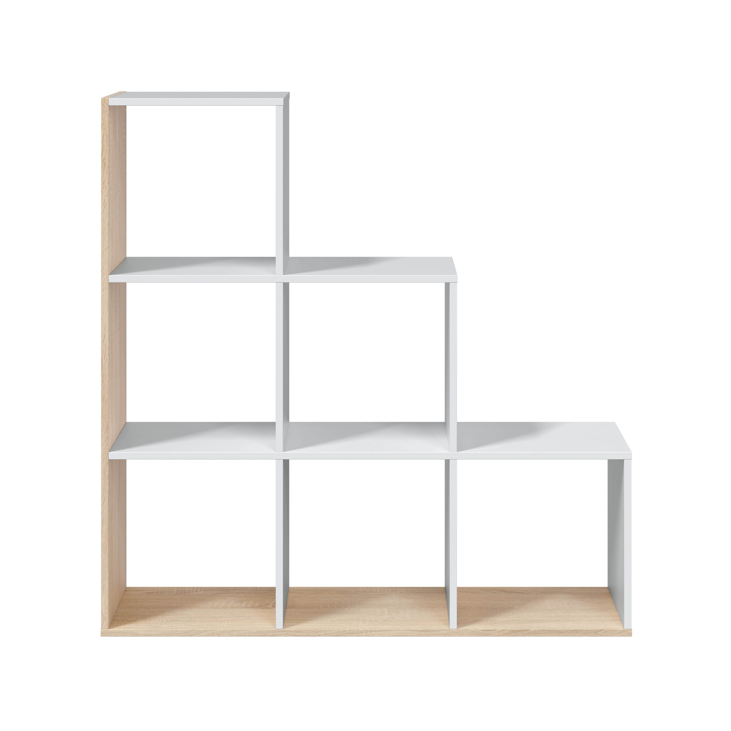 decorativa a forma di scaletta con 6 cubi 34 x 34 cm. Pannello truciolare melaminico spessore 15 mm. Bordi: PVC spessore: 0,6 mm . Tacchetti ABS antirumore e antigraffio per la parte inferiore del mobile. Dimensioni 108 x 28 x h 111 cm. Colore bianco artik e rovere canadian. Peso imballo 20 kg.