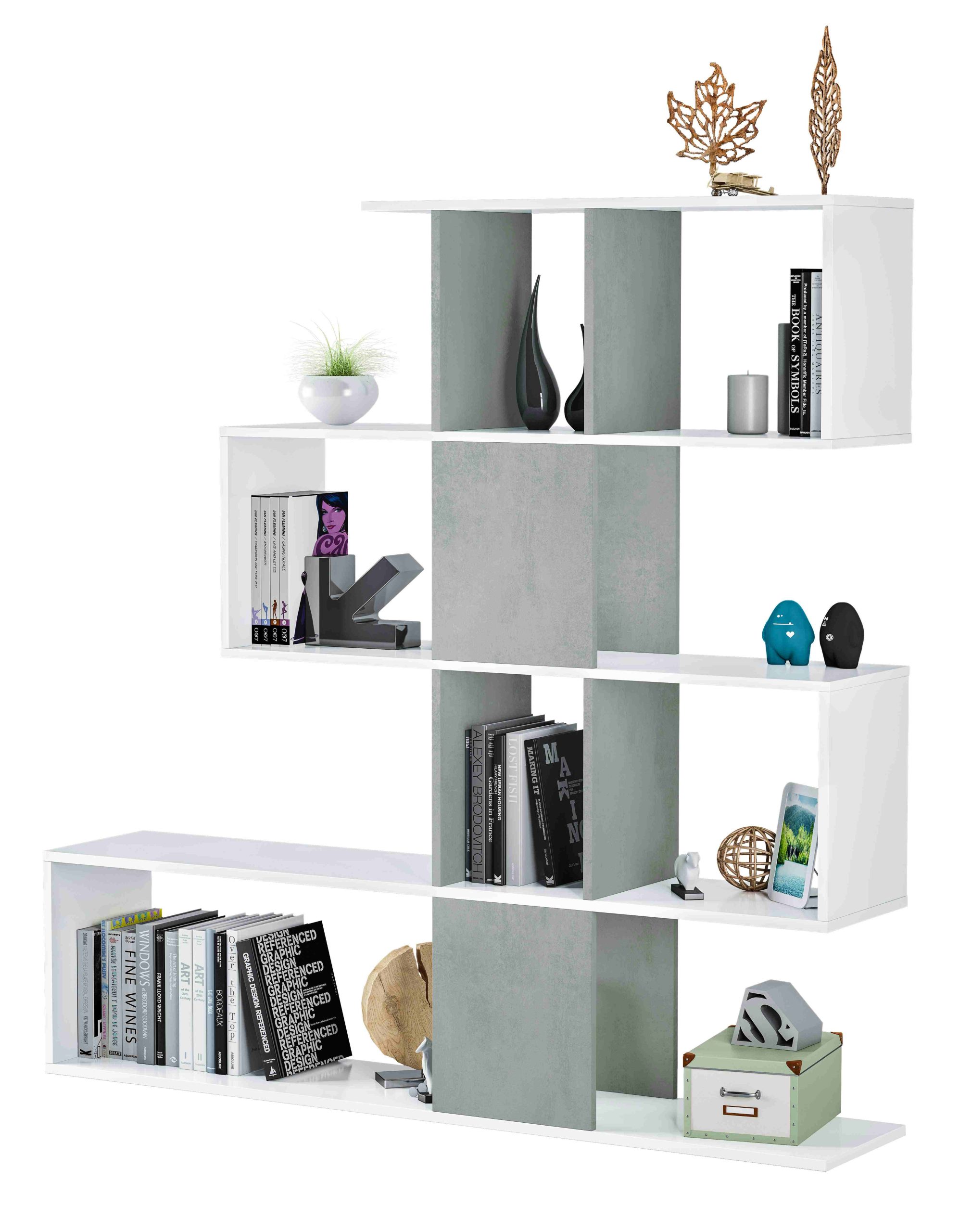 SERIE ZIG ZAG Libreria a giorno con 4 ripiani robusti. Struttura realizzata in truciolare melaminico spessore 15 mm. Facile da montare. Dimensioni 145 x 29 x h 145 cm. Colore bianco artik e cemento