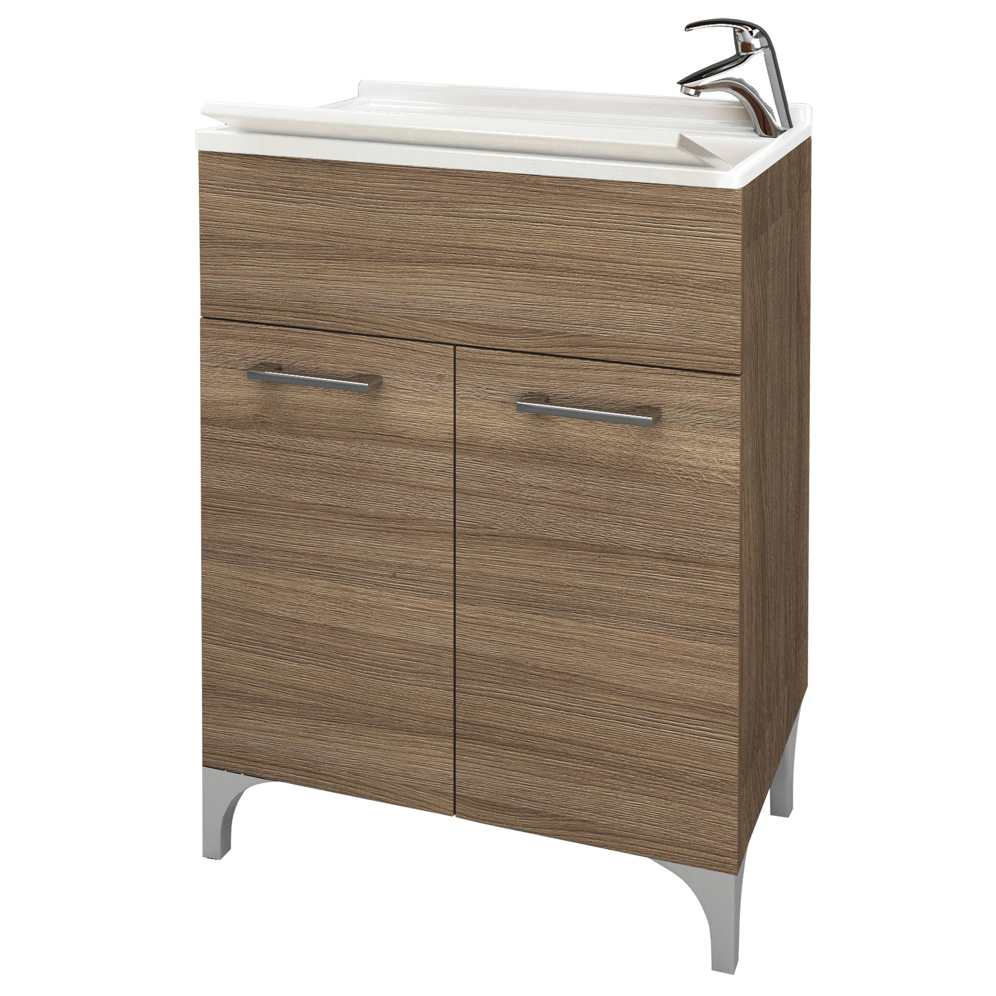 Mobile lavanderia in legno. Vasca e tavoletta in polipropilene resistente agli acidi. Completo di sifone. Predisposto per il montaggio del rubinetto monocomando (non compreso). Da montare. Dimensioni 60 x 50 x h 84 cm. Finitura rovere fumo
