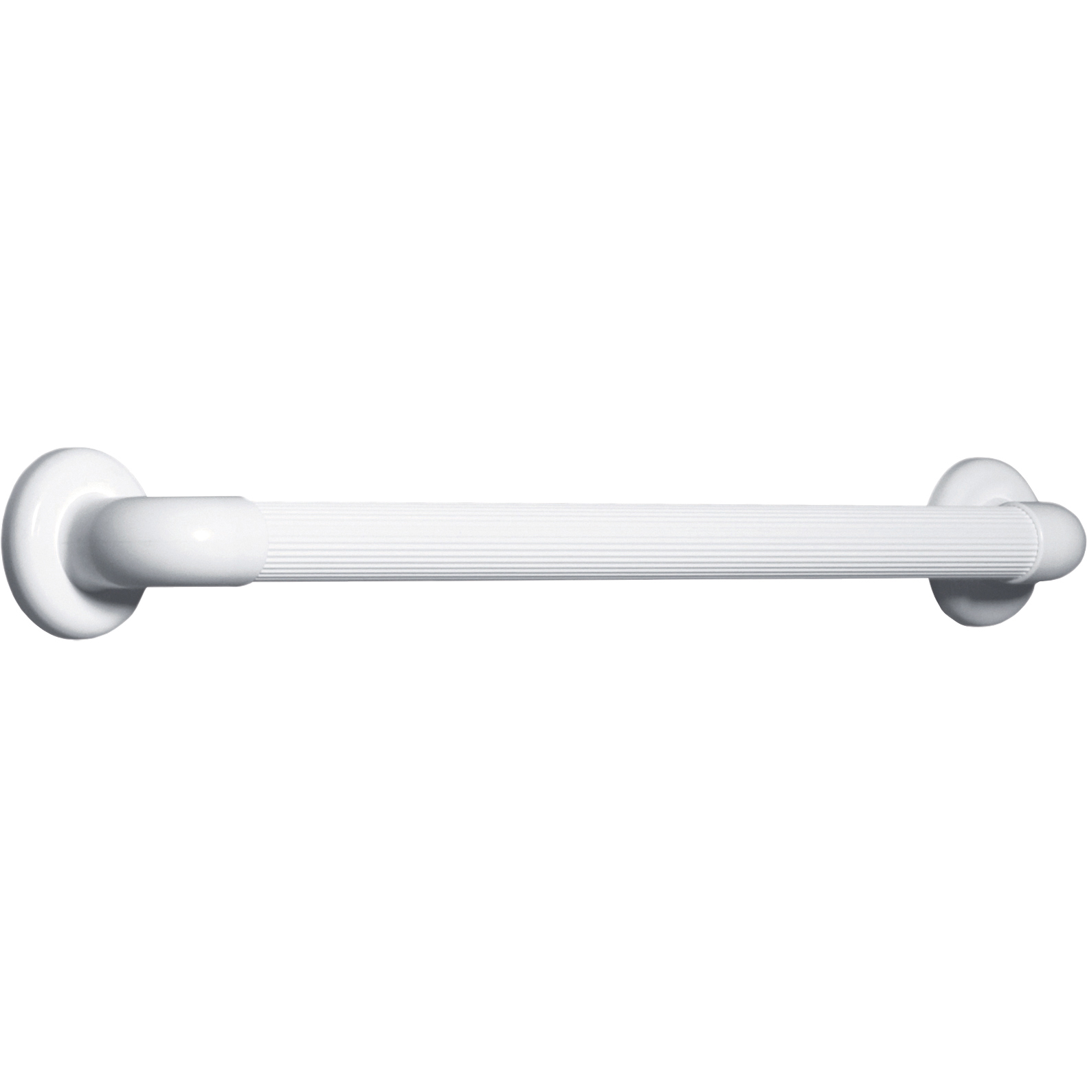 Corrimano lineare rigato in PVC medicale, Ø 3,5 cm, completo di piastre di fissaggio e ghiere coprivite in ABS. Isolato elettricamente, la barra rigata offre un’ottima presa antiscivolo e risulta caldo al tatto. Può essere montato in posizione orizzontale o verticale. Colore bianco. Portata 120 Kg. Dimensioni 30 x ø 8,5 x h 7,5 cm. Art. EH12-RX