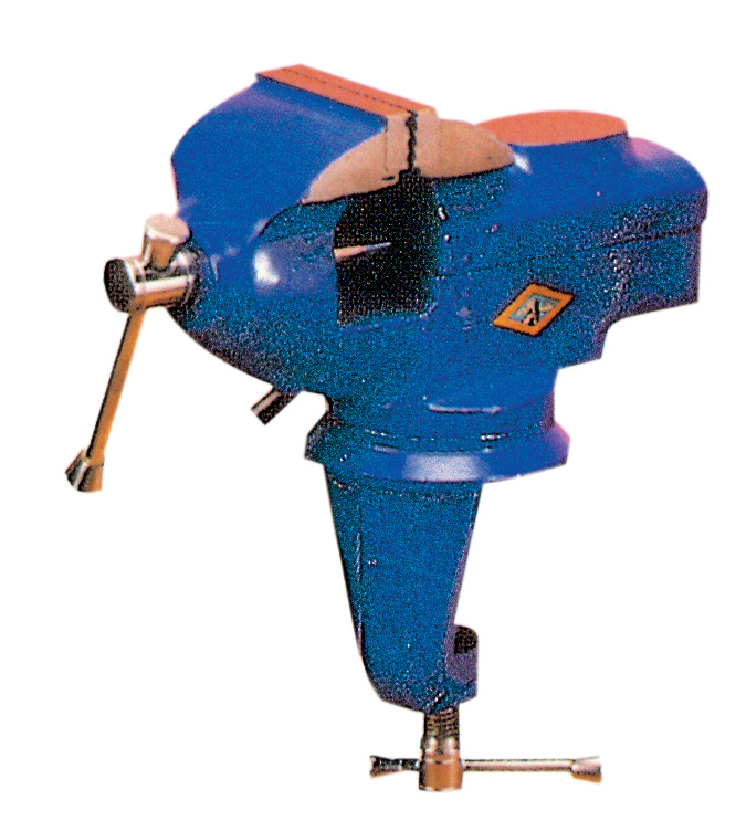 corpo in ghisa con incudine. Base girevole, fissaggio a vite. Larghezza ganasce 50 mm.