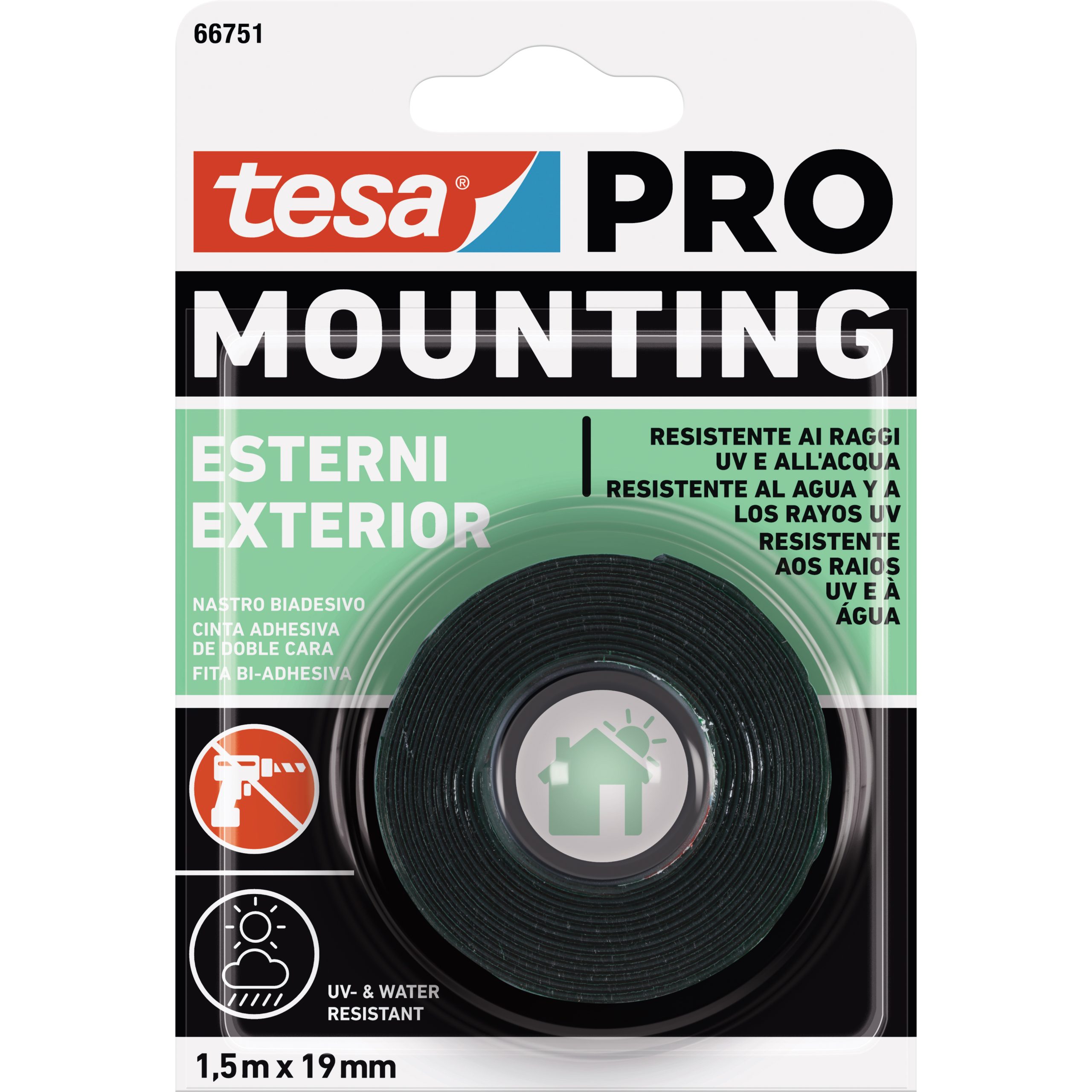 tesa Mounting PRO Esterni – Forte nastro biadesivo trasparente resistente ai raggi UV allacqua e agli sbalzi termici. Sostiene fino a 1 kg con soli 10 cm – per oggetti piatti fino a 10 mm di spessore. Adatto alla maggior parte delle superfici lisce e sufficientemente solide, aderisce a superfici particolarmente complicate come piastrelle, mattoni, metallo e plastica dura. E resistente ai raggi UV, allacqua e agli sbalzi termici garantisce delle giunzioni di lunga durata in esterni, come le cassette delle lettere o i numeri civici. Facile da usare Applicare in strisce verticali su tutta la lunghezza delloggetto o della superficie. Altezza 19 mm. Rotolo da 1,5 m.