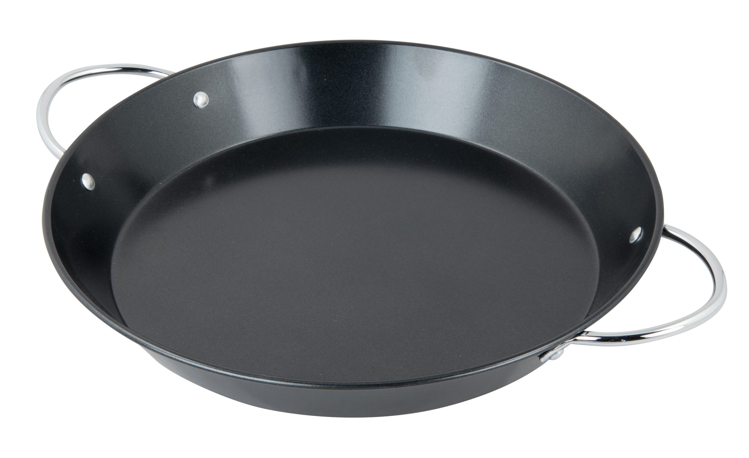 padella per paella in acciaio inox antiaderente con manici, compatibile con griglia in ghisa con anello rimovibile. si inserisce direttamente nella griglia in ghisa per assicurare la migliore distribuzione del calore.