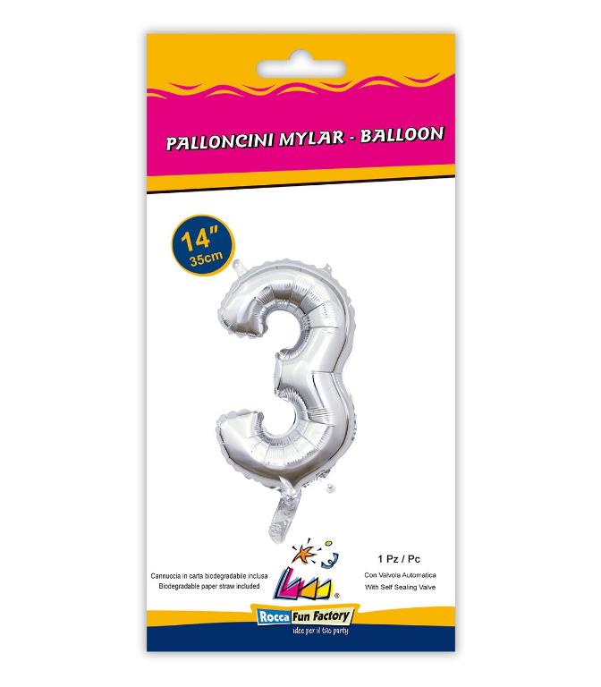 Pallone mylar numero 3 argento mini 14”-35 cm con valvola