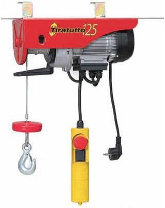 Modello TT 125 sollevatore con radiocomando wireless con 2 batterie alcaline AA. Potenza motore 450W. Tensione 230V – 50 Hz. Portata Max (tiro semplice) 100 kg. Portata Max (tiro doppio) 200 kg . Tiro utile 11 m (tiro semplice). Tiro utile 5,5 m (tiro doppio). Velocita’ di salita (tiro semplice) 10 m/min. Velocita’ di salita (tiro doppio) 5 m/min. Staffe per fissaggio con viterie. Fune ø 3 mm. Carico di rottura fune 1.200 kg. Peso elevatore 11 kg.