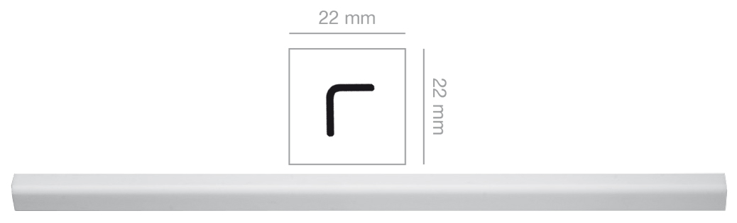 in polistirene ad alta densità. Resistenti a umidità, luce, urti e abrasioni. Incollabili e perforabili. Si puliscono con normali detergenti. Dimensioni mm 22×22 Spessore 3 mm Lunghezza 300 cm Colore BIANCO
