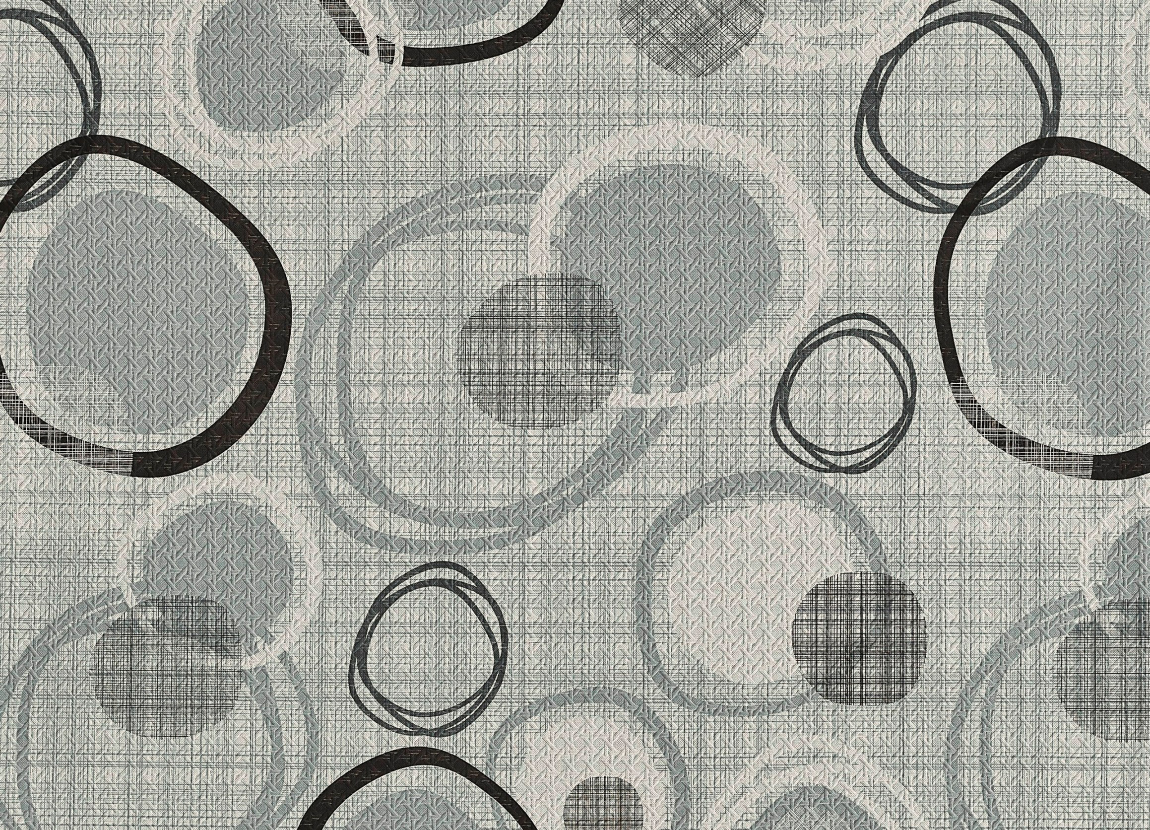 100 pvc sopra e sotto, tappeto a metro, modello Futura. Gommato con tattamento antiscivolo. Lavabile. Rotoli da 20 m. Altezza 52 cm. Colore Cerchi grigio.