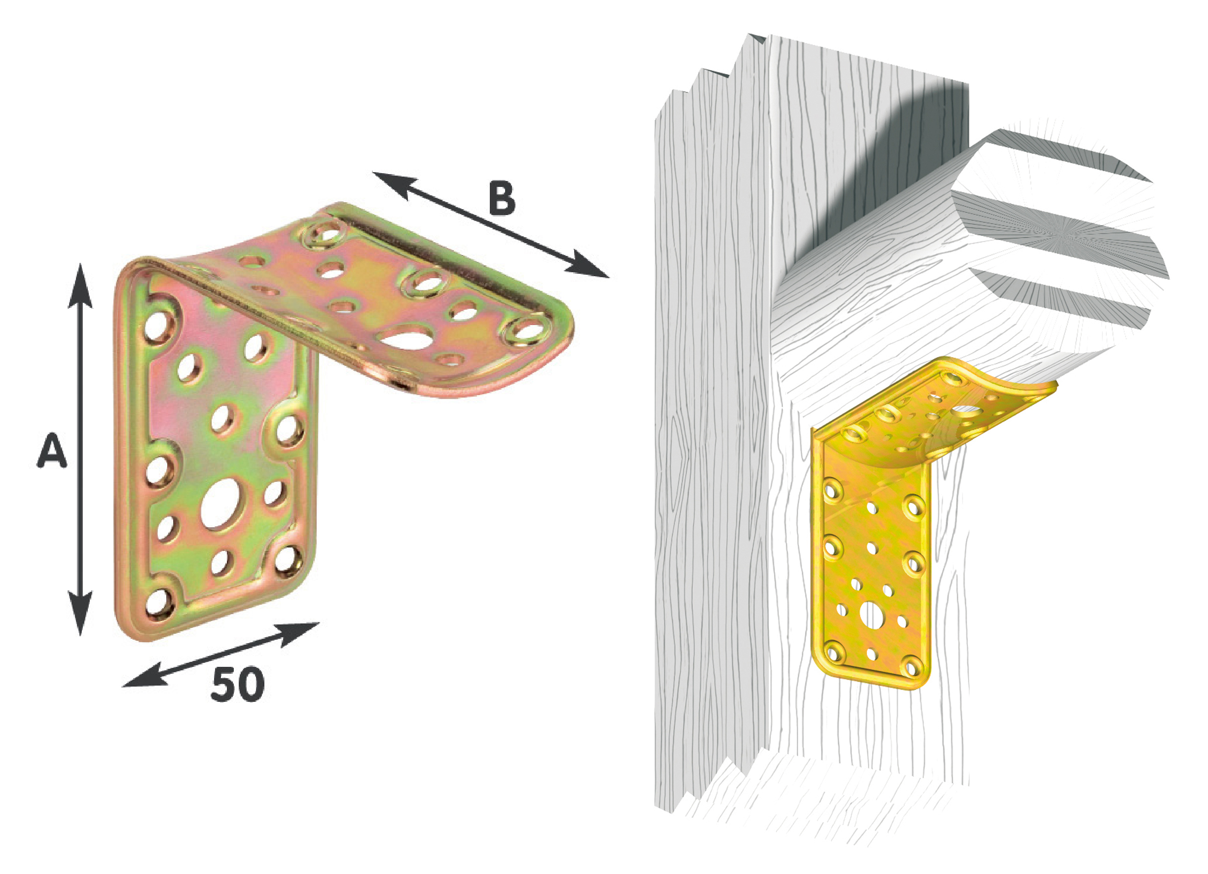 Art. 910 Giunzione a 90° per fissaggio su travi piane e palo tondo ø 80÷100 mm in legno. Spessore 2,2 mm. Dimensioni 50 x 80 x 80 mm. Peso 125 g.