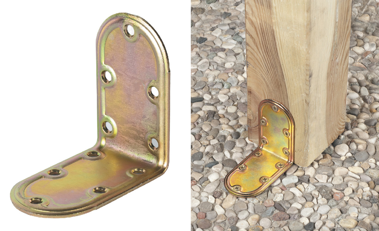 Art. 971 giunzione piegata arrotondata, modello pesante. Realizzata in acciaio tropicalizzato per pannelli e grigliati in legno. Dimensioni 40 x 40 mm. Spessore 2,2 mm. Peso 62 g.