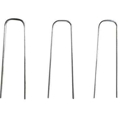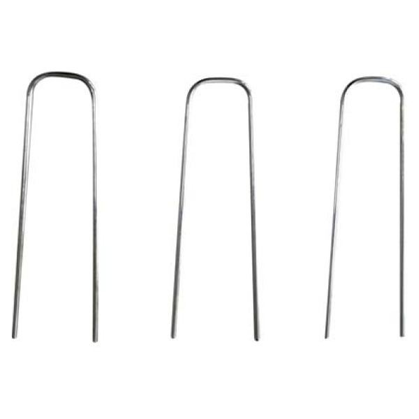 In filo zincato. Il particolare profilo ad U permette di fissare il telo pacciamatura al terreno.