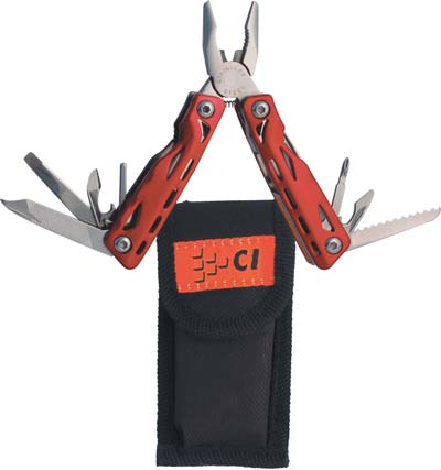 Con impugnatura in alluminio anodizzato. Con 7 accessori: lama, giravite, apribottiglia, apribarattolo, forbici, alesatore e seghetto. Completa di custodia. Dimensione Cm. 11.