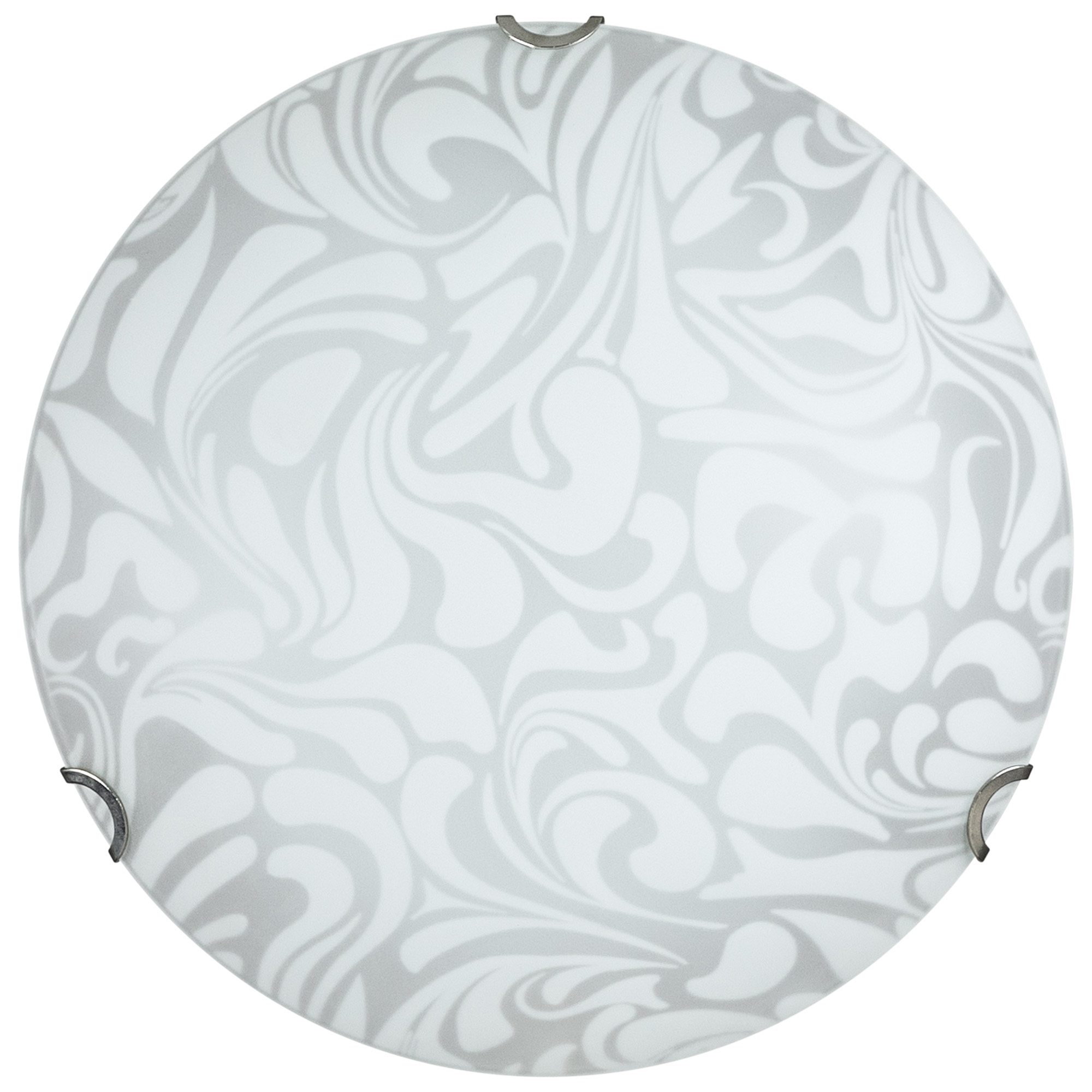 Plafoniera per parete o soffitto tonda con montatura in metallo verniciato bianco e ganci in metallo cromato, vetro in lastra spessore 3 mm serigrafato bianco, sabbiato esterno. Attacco E27 (grande) – 220/240V – 50 Hz – IP20. Max wattaggio lampadina 57W (non compresa). Dimensioni ø 300 x 100 mm. Peso 1,98 kg.