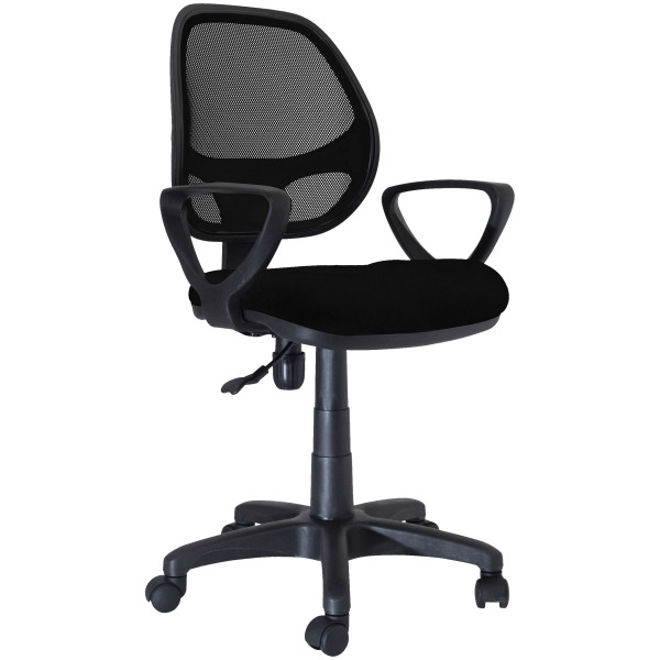 Poltrona Mod. New Manager con seduta in tessuto. Schienale antisudore ed ergonomico. Struttura con braccioli e base in polipropilene a cinque ruote piroettanti. Pistone con elevazione a gas permette la regolazione dell’altezza della seduta soddisfacendo qualsiasi tipo di esigenza. Da montare. Colore nero.