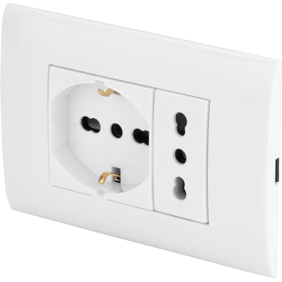 Placca premontata con presa bipasso 10-16A + presa bipasso schuko, completa di supporto e viti di fissaggio, IMQ, CE