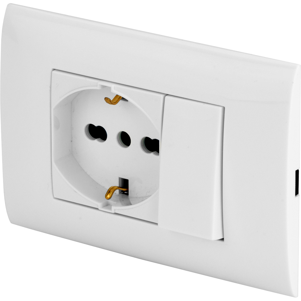Placca premontata con presa bipasso bipasso schuco + pulsante deviatore 16A, completa di supporto e viti di fissaggio, IMQ, CE,