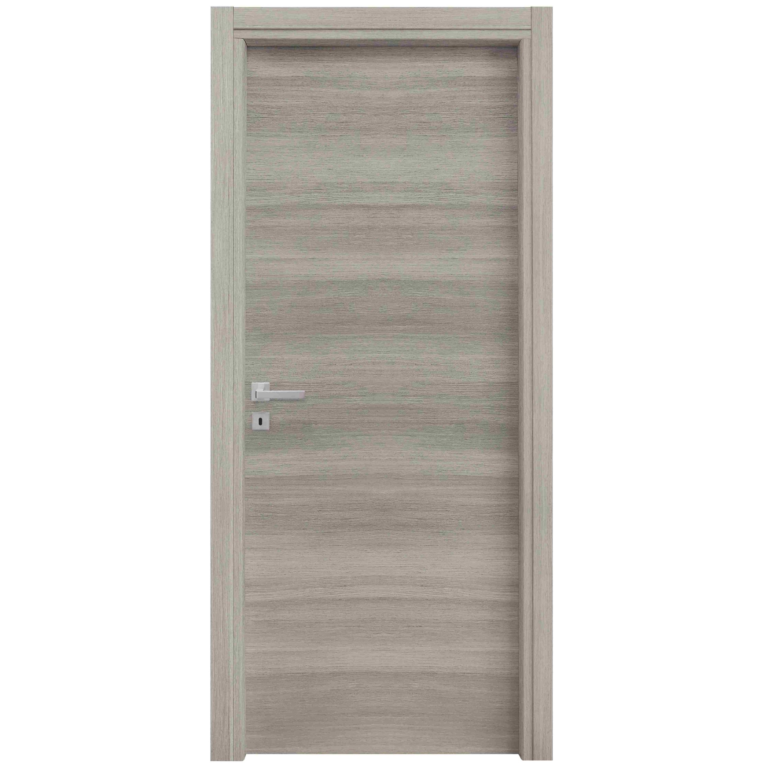 Anta tamburata di spessore nominale 44 mm, riempimento in cartoncino trattato, placcato con pannelli in MDF spessore 3/4 mm nobilitato con carta finish. Telaio piatto in MDF di spessore 40 mm con guarnizione di battuta di gomma. Coprifilo telescopici esterno ed interno in Mdf da 60 mm con aletta utile da 8 mm. Ferramenta serratura mediana. Anuba reversibili. Dimensioni 210×90 cm. Colore rovere grigio