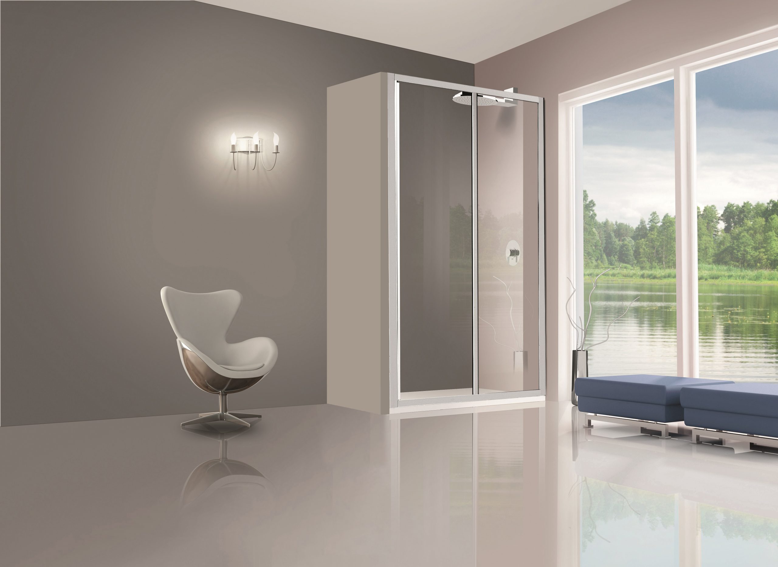 Porta per box doccia ad un’anta con scorrimento su pattini in nylon e una fissa con profili in alluminio argento lucido. Pareti in cristallo trasparente dallo spessore di 3 mm. Apertura 41 cm. Estensibilità 94/99 x h 185 cm.