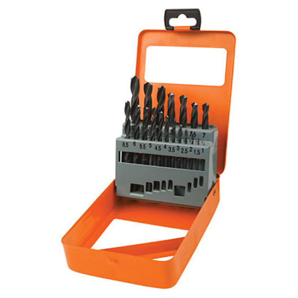 Assortimento di punte HSS DIN 338, interamente rettificate. Misure da Mm. 1-10, comprese le mezze misure Mm. 0,5. In astuccio metallico appendibile.