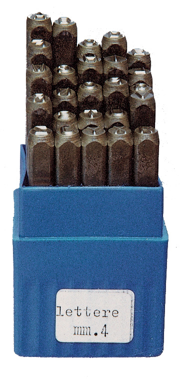 in acciaio con caratteri a filo. Per marcare metalli. Serie da 25 lettere. Altezza 4 mm. Dimensioni punzone 6,4×60 mm
