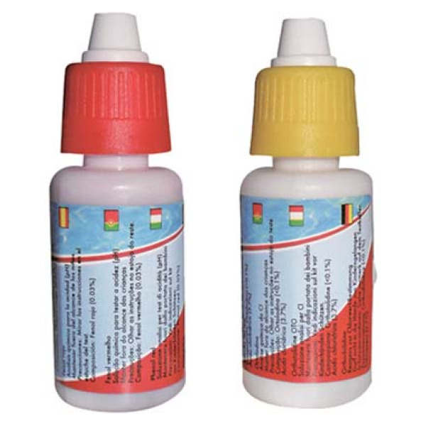 Flaconi di ricambio da Ml. 20 per il Test Kit di controllo per PH e Cloro (Art. 61.103.18). Completo di 1 Flacone da Ml. 20 di ortotolidina per l’analisi del cloro libero e 1 Flacone da Ml. 20 di red-phenol per l’analisi del PH.