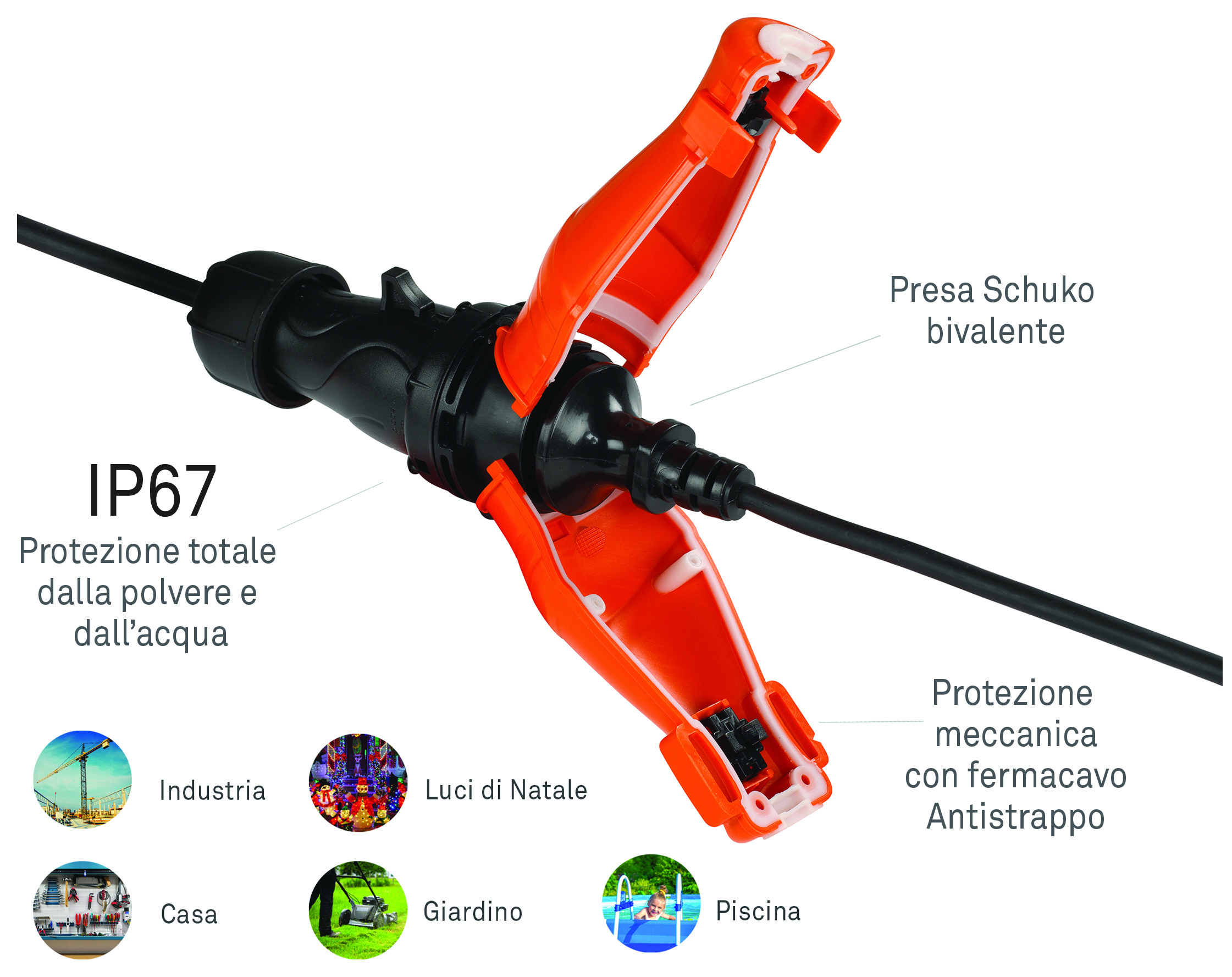 Art. 1823 con fermacavo antistrappo e guscio di protezione per spina schuko pressofusa. Grado di protezione IP67