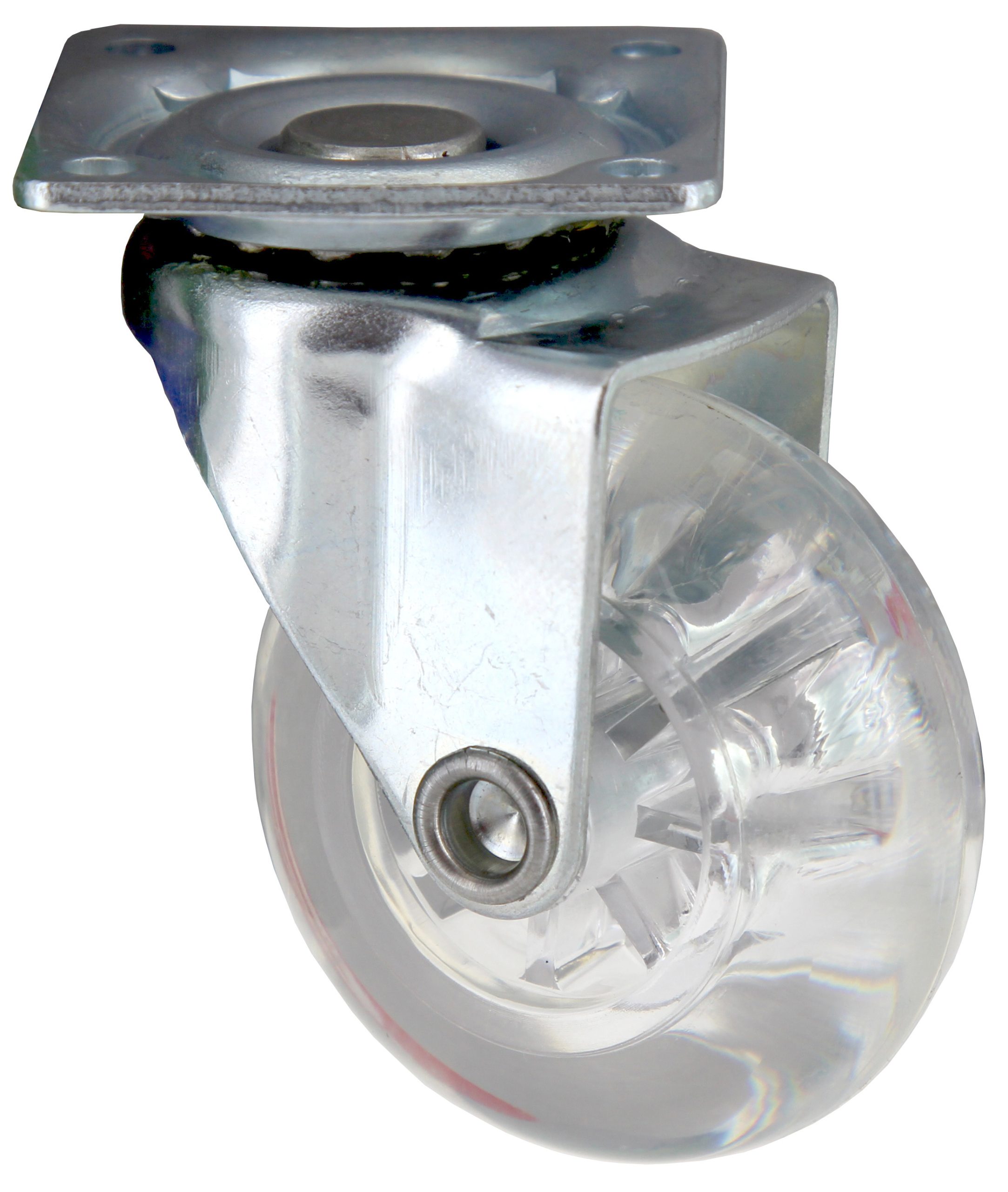 girevole, realizzata in gomma. Supporto in acciaio stampato. Attacco con piastrina quadrata 42 x 42 mm. Ruota trasparente ø 50 mm. Carico max 40 kg.