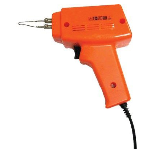 Con impugnatura anatomica e luce led. Alimentazione Volt 220. In dotazione: valigetta in plastica, 3 punte per saldatura, stagno e pasta per saldare.