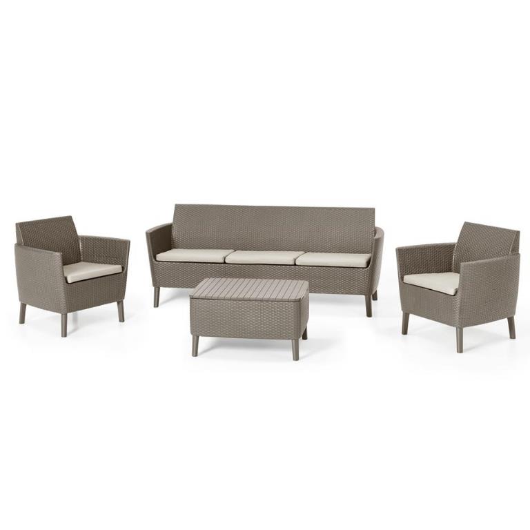 Set da 4 pezzi formato da: un divano a 2 posti, due poltrone ed un tavolino contenitore. Cuscini per seduta compresi.