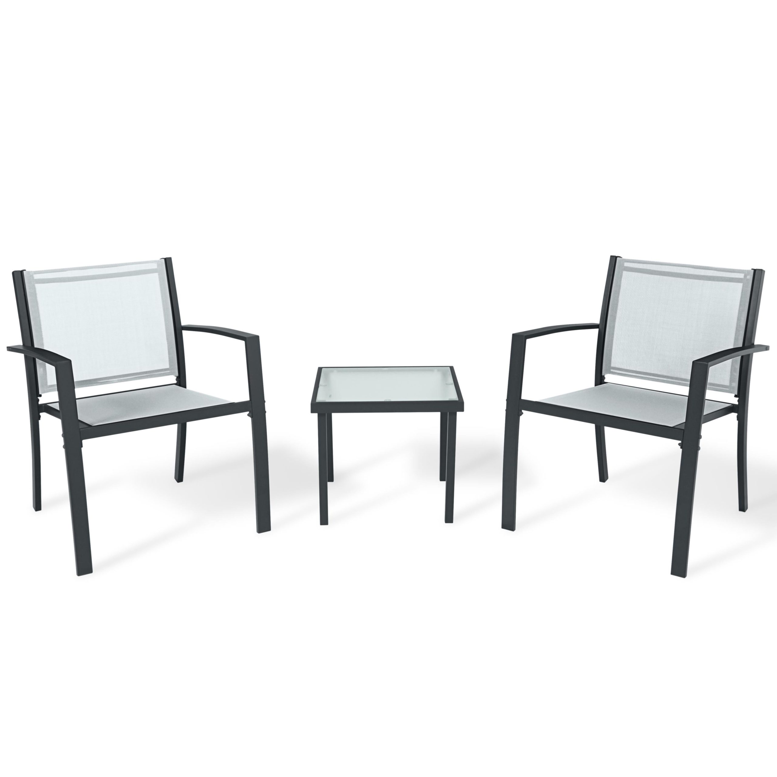 struttura in acciaio, seduta e schienale in textilene.Tavolino da aperitivo – colazione con vetro temperato spessore 5 mm. Composto da: 2 poltrone con seduta 58 x 58 x h 75 cm, tavolino 44 x 44 x h 38 cm. Colore tortora.