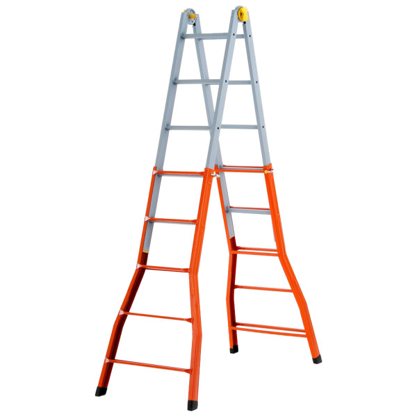 in acciaio saldato, verniciato con polveri epossidiche. Con cerniera automatica di sicurezza. Sezione montanti interno 50 x 20 mm. Sezione montante esterno 55 x 25 mm. Portata max 125 kg. A norma europea EN 131. 5+5 gradini. Dimensioni chiusa 59 x 19 x h 141 cm. Altezza a forbice 245 cm. Altezza max 481 cm. Peso 17,2 kg.