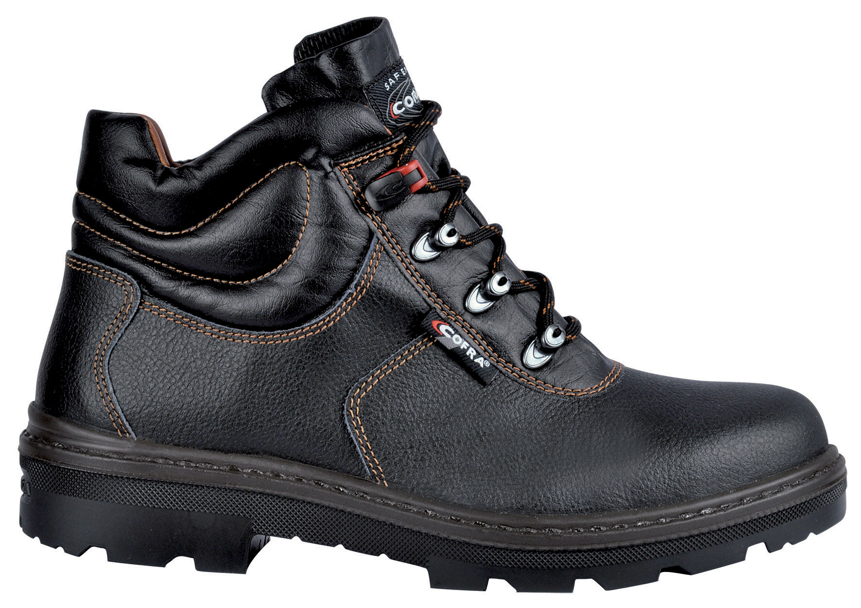 Mod. PARIDE BIS S3 SRC tipo alto, soletta in tessuto antiperforazione, tomaia in pelle al cromo, puntale in acciaio, paramalleolo imbottito, suola in poliuretano bidensità stampata IDEAL. Sfilamento rapido. Complete di tallonetta antimicrobica trasp