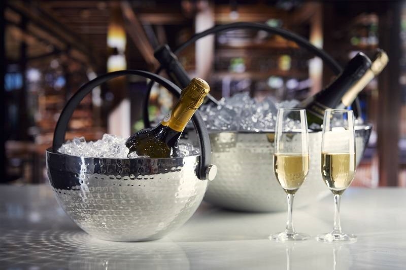 Secchiello portaghiaccio in acciaio martellato con manico in pelle d.43 cm