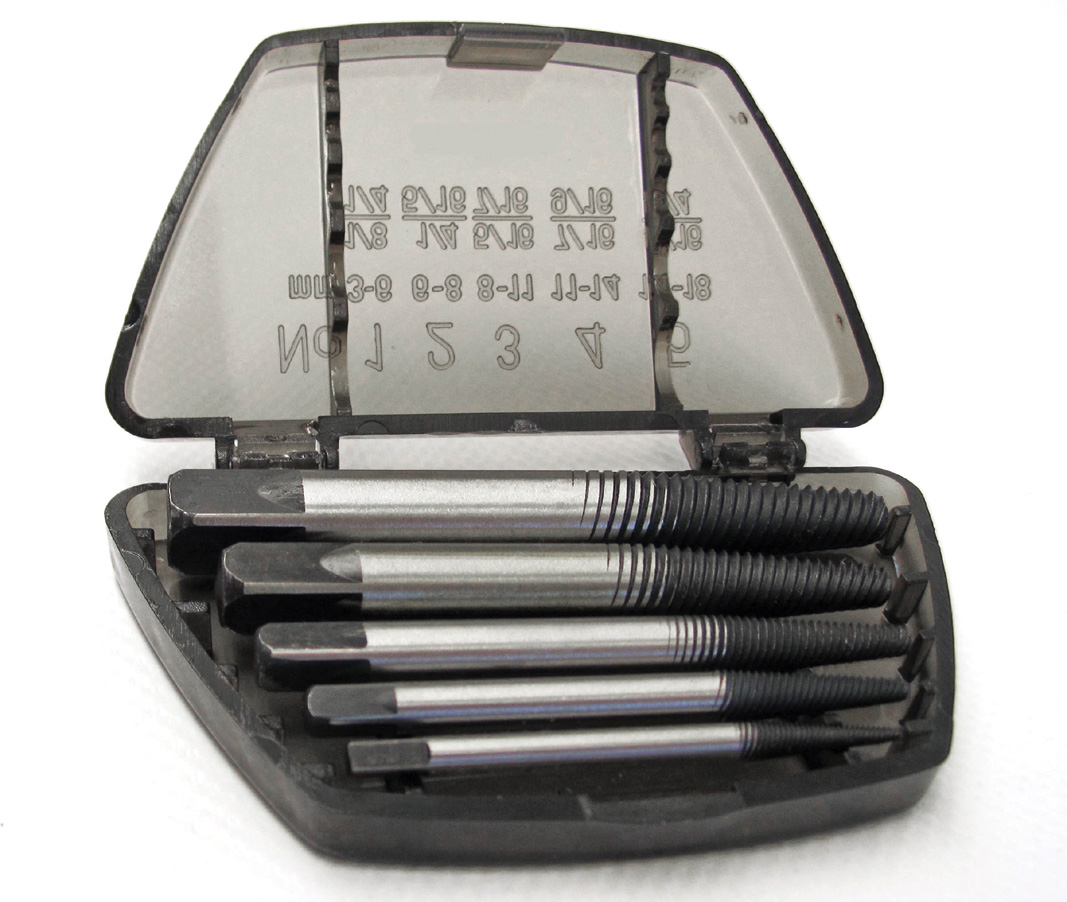 In acciaio forgiato. Per estrarre viti e prigionieri danneggiati. DIN 225 (EN 22568). Composto da 5 pezzi grandezza 1, 2, 3, 4, 5. Attacco quadro per portautensili. Utilizzabile per viti e prigionieri da M3 a M18. In astuccio di plastica