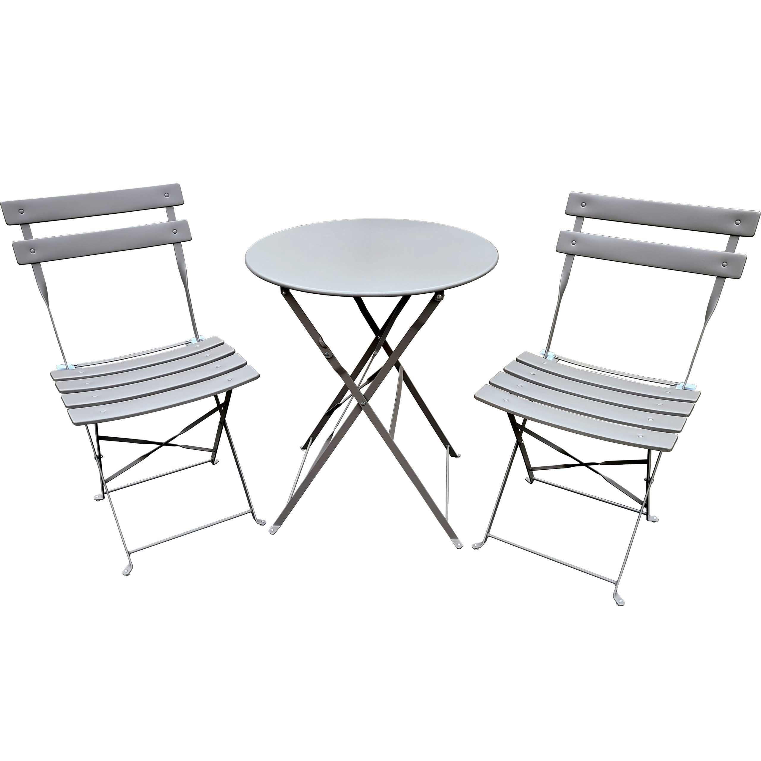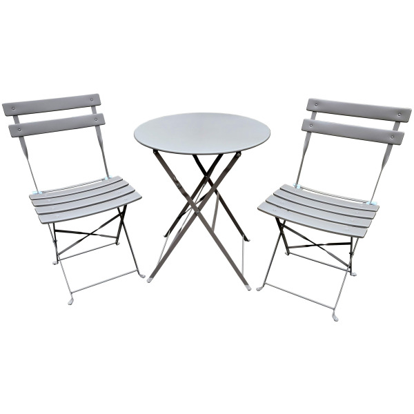 in acciaio verniciato. Pieghevole. Composto da: tavolino cm ø 60x70h due sedie cm 42x48x81h tortora