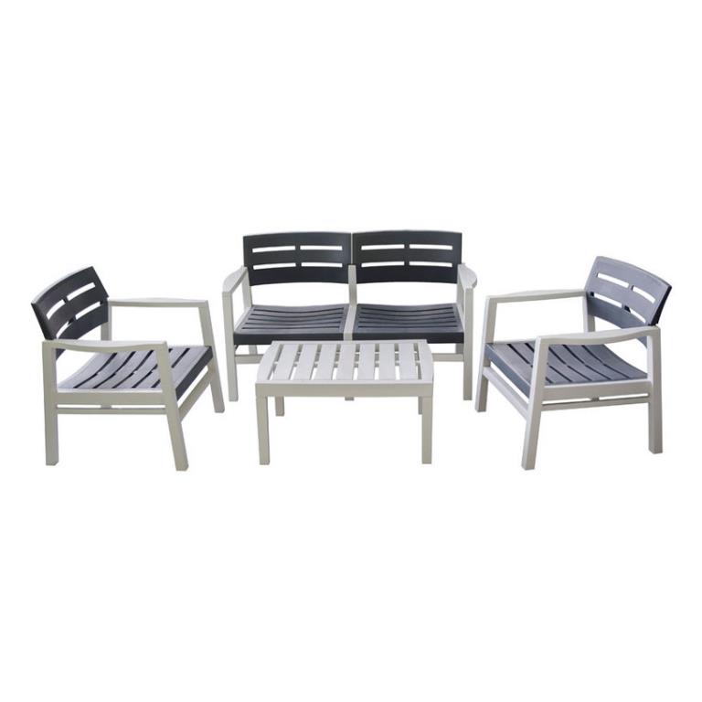 Set da giardino polipropilene Surabaya grigio/bianco. Realizzato interamente in polipropilene con seduta accogliente e confortevole. Composto da 1 tavolino. 2 poltroncine. 1 divanetto doppio posto. Ottima soluzione d’arredo per impiego in ambienti indoor o outdoor.