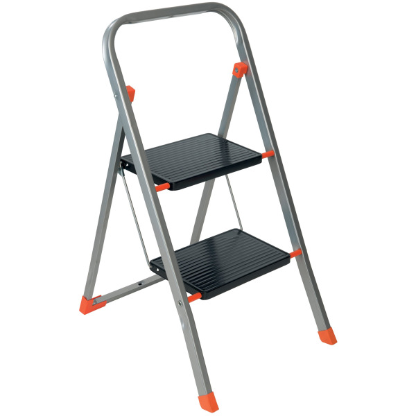 realizzato in acciaio tubolare 20 x 15 mm. 2 gradini acciaio 20 x 30 cm. Verniciato con brillanti polveri epossidiche. Dimensioni aperto 46 x 56,5 x h 81,5 cm, chiuso 46 x 3,5 x h 89 cm. Altezza pedana da terra 50 cm. Altezza di lavoro utile 240 cm. Portata max 150 kg. Telaio grigio, gradini neri, plastiche arancioni. Peso 4,0 Kg.