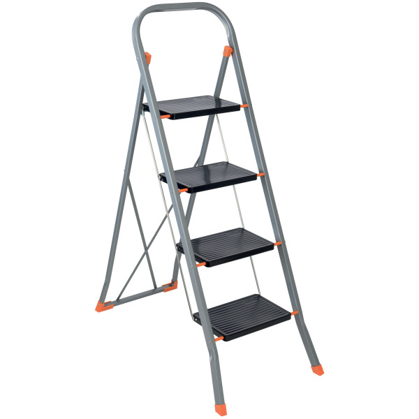 realizzato in acciaio tubolare 20 x 15 mm. 4 gradini acciaio 20 x 30 cm. Verniciato con brillanti polveri epossidiche. Dimensioni aperto 46 x 82 x h 126,5 cm, chiuso 46 x 3,5 x h 141 cm. Altezza pedana da terra 100 cm. Altezza di lavoro utile 290 cm. Portata max 150 kg. Telaio grigio, gradini neri, plastiche arancioni. Peso 7,8 Kg.