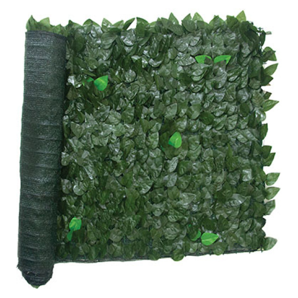 Foglie e rete ombreggiante cucite su supporto in rete plastica. Stabilizzata UV.