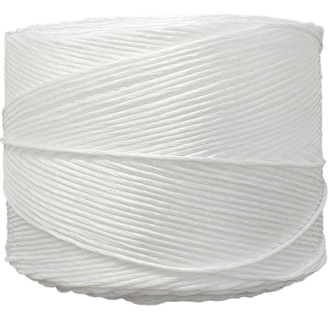 Titolo 300. in polipropilene bianco. Stabilizzato ai raggi UV, certificato per uso alimentare. Impiegato frequentemente per uso agricolo, industriale ed imballaggi vari. Privo di nodi. Fibrillato.Sviluppo m/kg 280. Resistenza alla rottura 145 kg. Bobina da 2 kg.