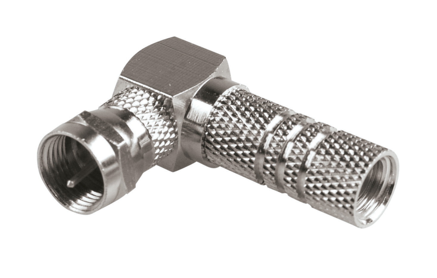 Spina TV ?tipo F? con uscita cavo a 90° per impianti satellitari, adatta per cavi coassiali ø 7 mm.