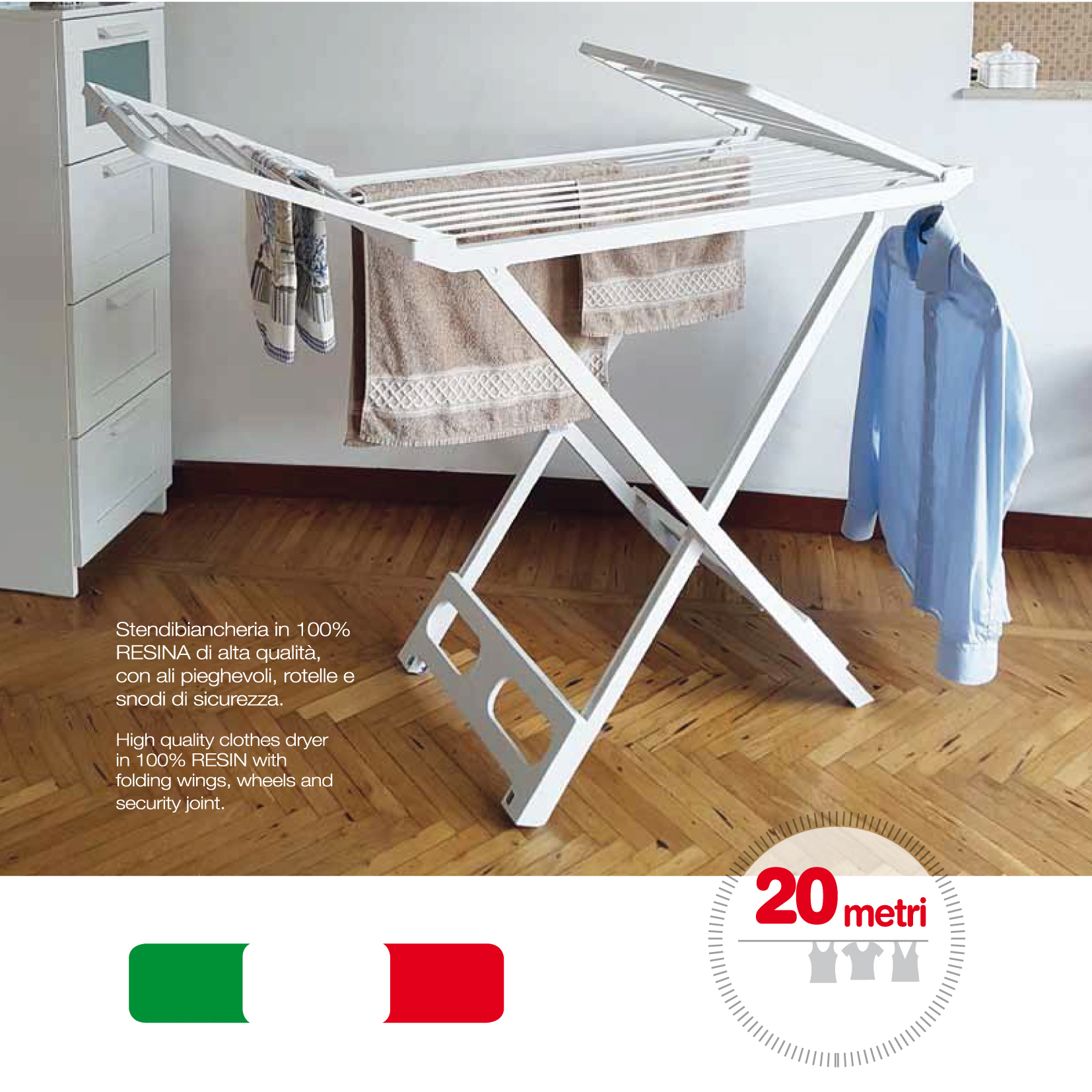 realizzato in 100% resina di alta qualita’, con ali pieghevoli , rotelle e snodi di sicurezza. Per stendere fino a 20 m di bucato. Dimensioni aperto 180 x 55 x h 95 cm, chiuso 550 x h 130 cm. Peso 5 kg. Colore bianco.