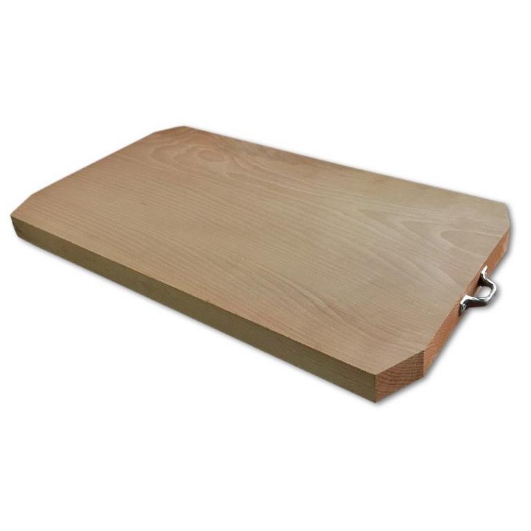Tagliere rettangolare unipezzo, con angoli troncati, in legno grezzo.